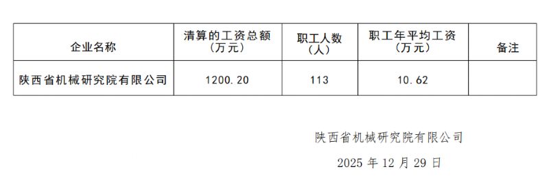 陜西省機械研究院有限公司2024年度工資分配信息披露